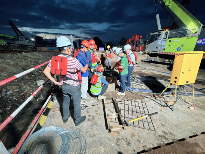 在施工現場,建設團隊嚴格依照標準化施工流程推進作業。從施打鋼護筒筑牢基礎防線,到旋挖機精準鉆孔;從初次清孔、鋼筋籠精準下放,再到安裝導管、二次清孔,直至完成水下混凝土澆筑,每一個環節都經過精密測算與嚴格把控。過程中,建設單位園區公司、監理單位、施工單位三方組成專項攻堅小組,全程駐守現場,通過技術交底、實時監測、動態調整,全力確保澆筑過程萬無一失。