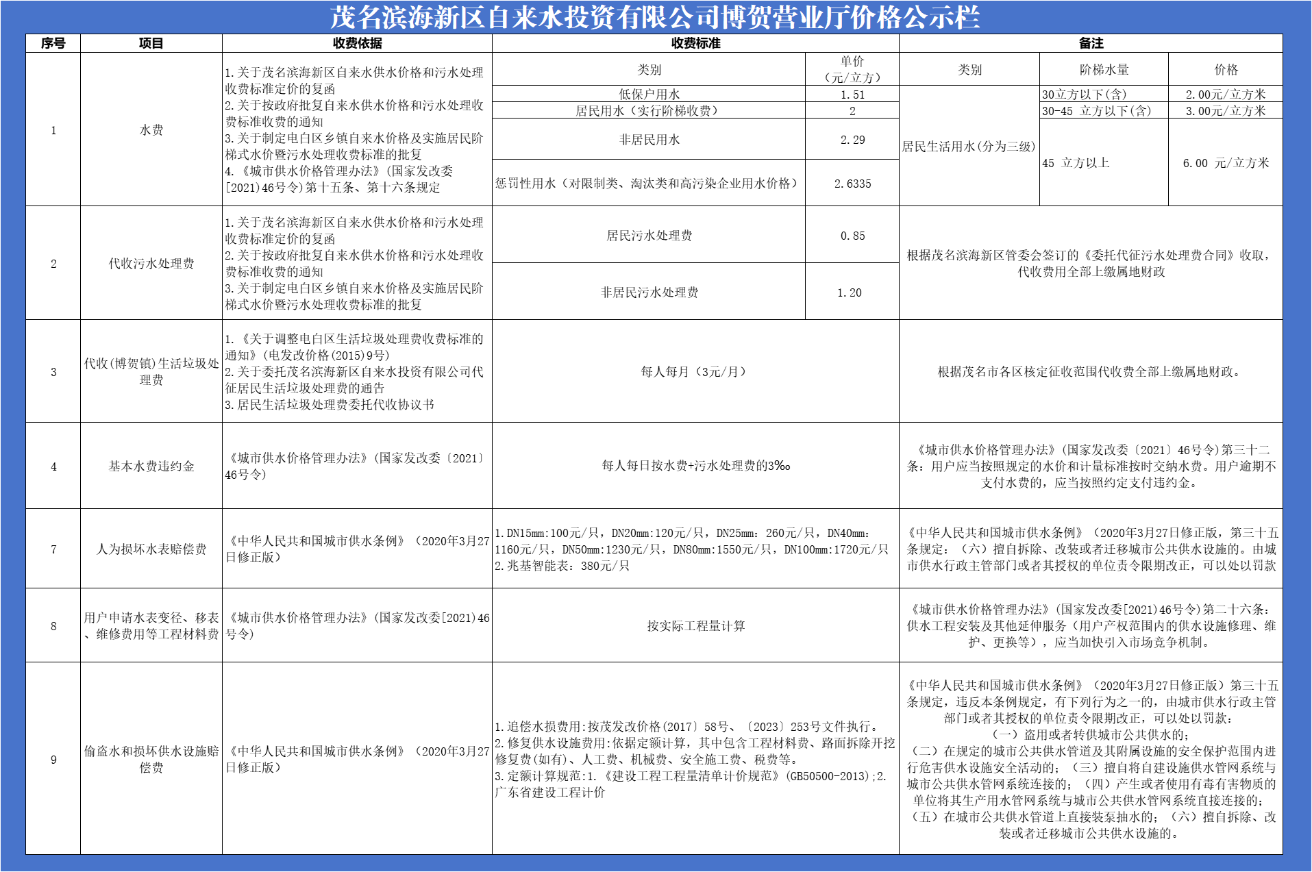 茂名濱海新區(qū)自來(lái)水投資有限公司自來(lái)水收費(fèi)標(biāo)準(zhǔn)公示