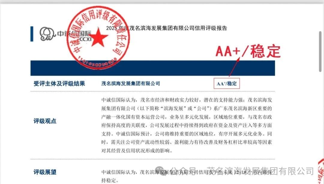 2025年9月30日,茂名濱海發(fā)展集團有限公司(以下簡稱“濱海發(fā)展集團”)迎來發(fā)展史上的重要里程碑——國內(nèi)權(quán)威信用評級機構(gòu)中誠信國際信用評級有限責(zé)任公司正式發(fā)布評級報告,評定集團主體信用等級為AA+,評級展望為“穩(wěn)定”。