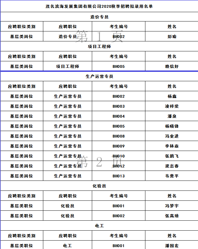 茂名濱海發展集團有限公司2020年秋季招聘擬錄用名單公示