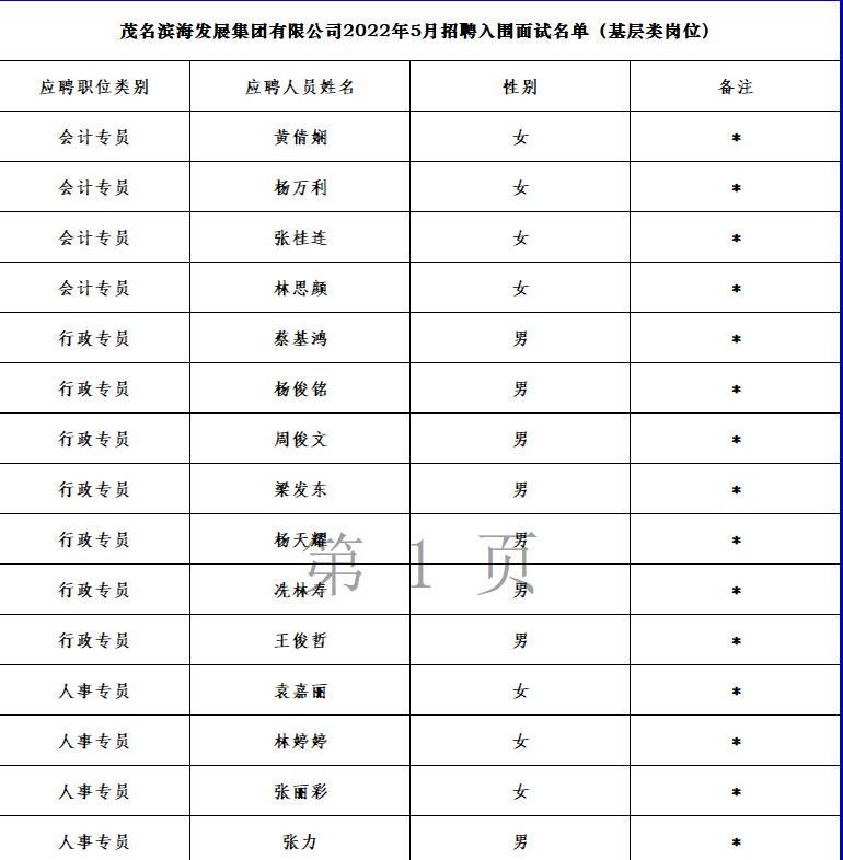 茂名濱海發(fā)展集團(tuán)有限公司2022年5月入圍面試名單公示