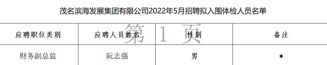 茂名濱海發(fā)展集團(tuán)有限公司2022年5月招聘擬入圍體檢名單公示