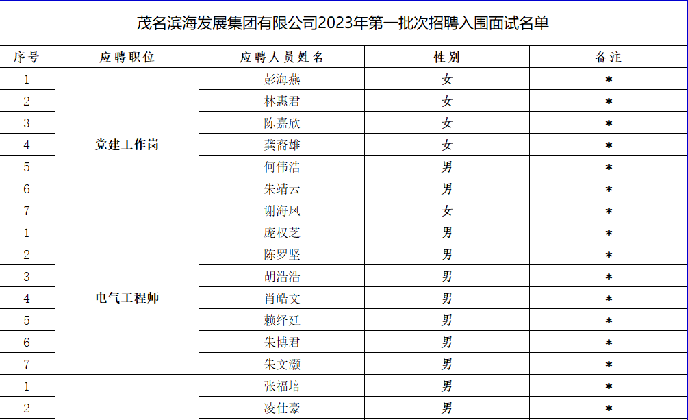 茂名濱海發(fā)展集團(tuán)有限公司2023年第一批次招聘入圍面試名單公示