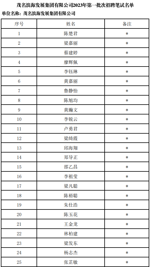茂名濱海發(fā)展集團(tuán)有限公司2023年第一批次招聘筆試名單公示